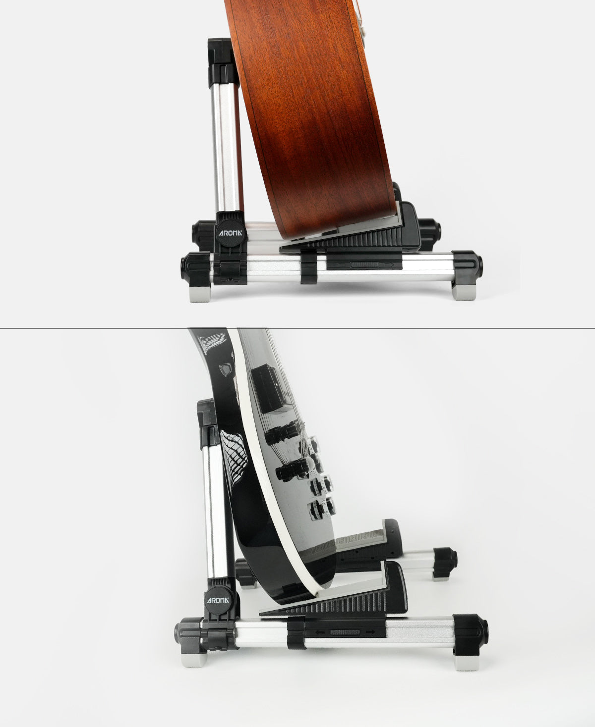 The Aroma guitar stand features a stepped yoke with a sliding adjustment design, allowing it to adapt precisely to guitars of varying body thickness—from slim electrics to full-sized acoustics and basses. Just slide to fit—no wobble, no gaps, just stable support every time.