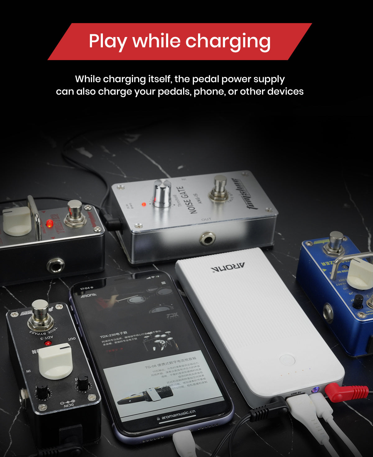 Break free from bulky gear. At just 0.67 inches thick (dimensions: 5.83 × 2.59 × 0.67 in), the Aroma guitar pedal battery power bank fits easily into your gig bag or backpack, making it easy to carry wherever you go. It supports a charge while use mode, allowing you to charge your guitar pedal battery while also charging your pedals, phone, or other devices.