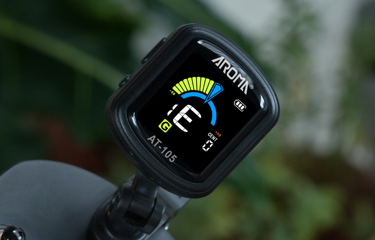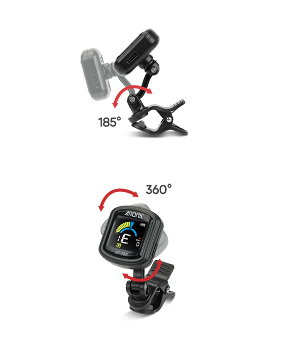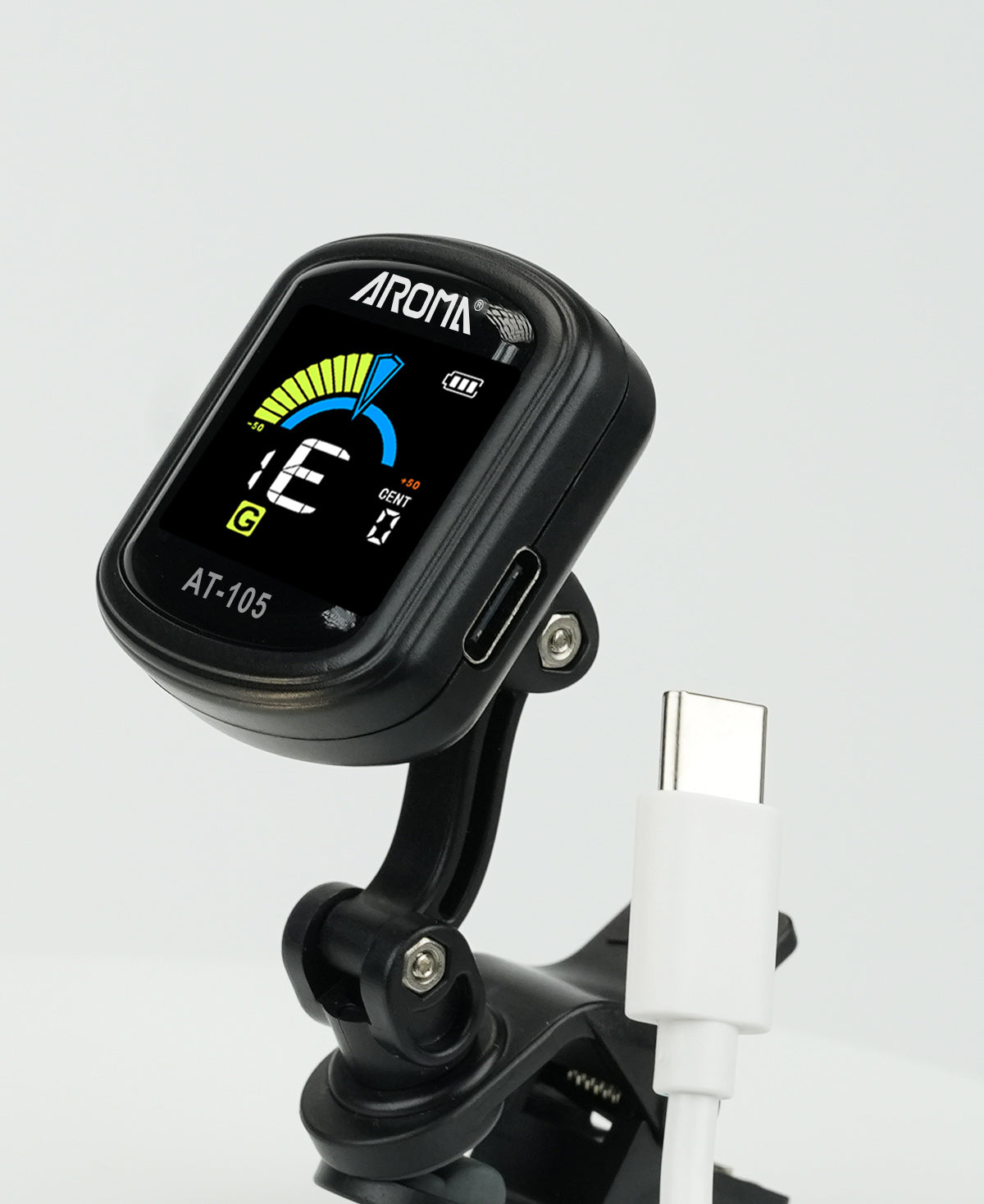The Aroma Professional Guitar Tuner combines thoughtful engineering with reliable performance. Its 360° dual-axis rotation lets you position the vivid HD screen exactly where you need it, while soft silicone grips protect your instrument. With fast USB-C charging and long-lasting battery life, it’s a compact, rechargeable tuner built for every serious player.
