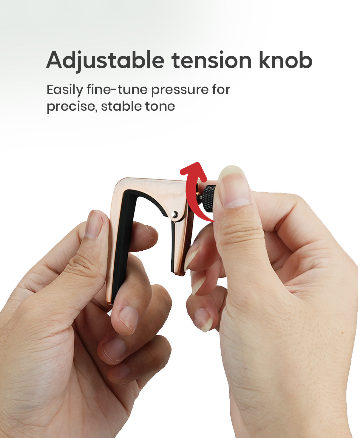 Say goodbye to fret buzz and tuning issues. With its adjustable tension knob, the Aroma guitar capo gives you pinpoint control over neck pressure, delivering flawless tone and pitch-perfect performance every single time, no matter how hard you play.