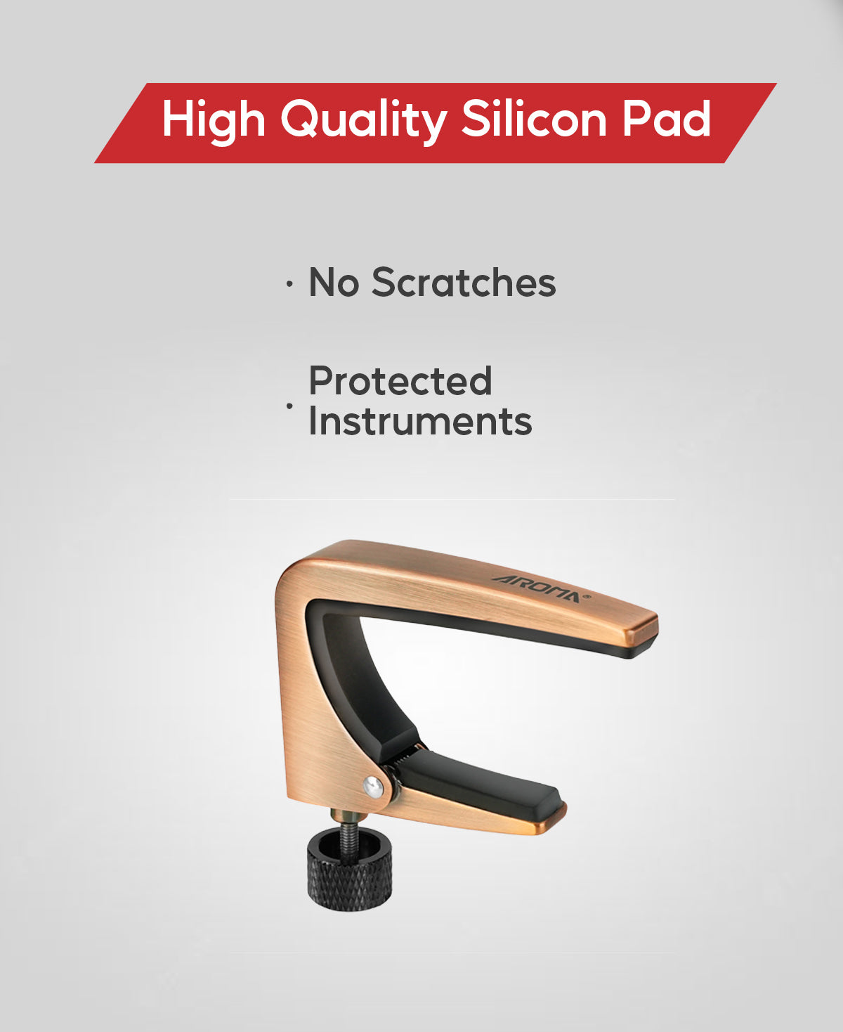 Flexible silicone pads keep your guitar safe from pressure marks, scratches and damage. Whether you're practicing at home or shredding on stage, this Aroma guitar capo ensures nothing gets between you and your performance.
