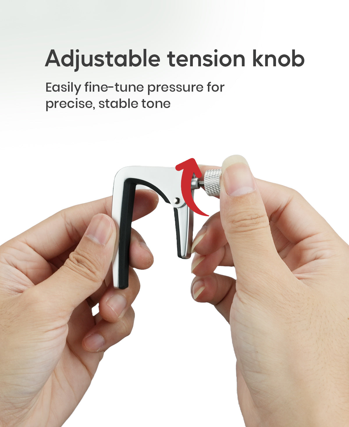 Say goodbye to fret buzz and tuning issues. With its adjustable tension knob, the Aroma guitar capo gives you pinpoint control over neck pressure, delivering flawless tone and pitch-perfect performance every single time, no matter how hard you play.