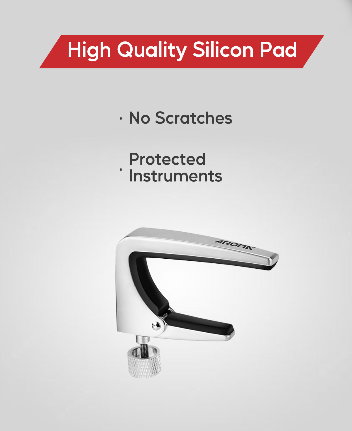 Flexible silicone pads keep your guitar safe from pressure marks, scratches and damage. Whether you're practicing at home or shredding on stage, this Aroma guitar capo ensures nothing gets between you and your performance.